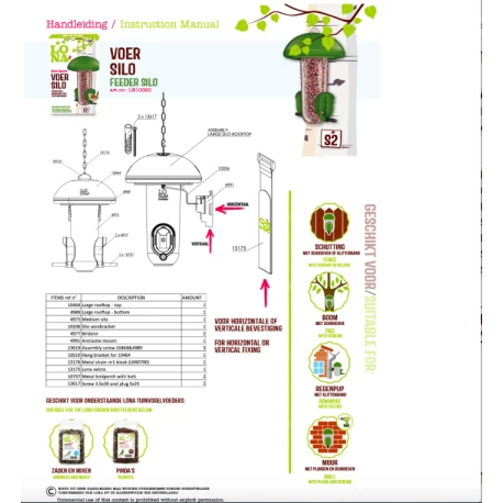 Pour les petits oiseaux de jardin comme les mésanges, les pinsons, les moineaux et les espèces similaires. Facile à fixer à un piquet, tronc d’arbre, clôture, mur ou pergola.