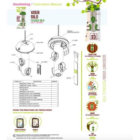 Pour les petits oiseaux de jardin comme les mésanges, les pinsons, les moineaux et les espèces similaires. Facile à fixer à un piquet, tronc d’arbre, clôture, mur ou pergola.